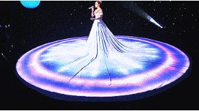 早在2015年的《美国偶像》上,Jennifer Lopez就身着一条直径6米白色投影裙,她唱着唱着,白裙子就消失在黑夜里,星空和宇宙,慢慢爬上了她的裙摆,随着灯光的变化,她的裙子上出现了云彩、银河、雨点。从上往下看,就像一个圆形的幕布一样,给现场着实带来了一场充满科技感的视觉盛宴。